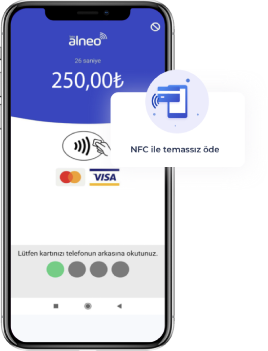 Alneo üye işyerleri NFC teknolojisi sayesinde Android 5.0 ve üstü işletim sistemine sahip cihazları ile saniyeler içinde tahsilatlarını yapabiliyor. Böylece müşteriler temassız özelliği olan kredi kartlarını NFC teknolojisine sahip bir cihaza yaklaştırarak sadece birkaç saniye içinde hızlı, pratik ve güvenli bir şekilde ödeme gerçekleştirebiliyor.